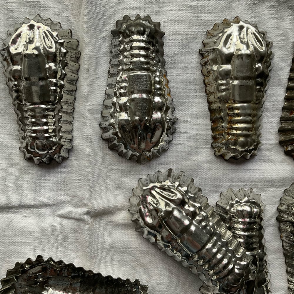 Twelve little metal lobster or crayfish moulds.