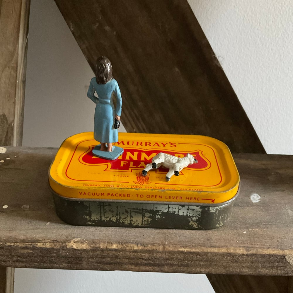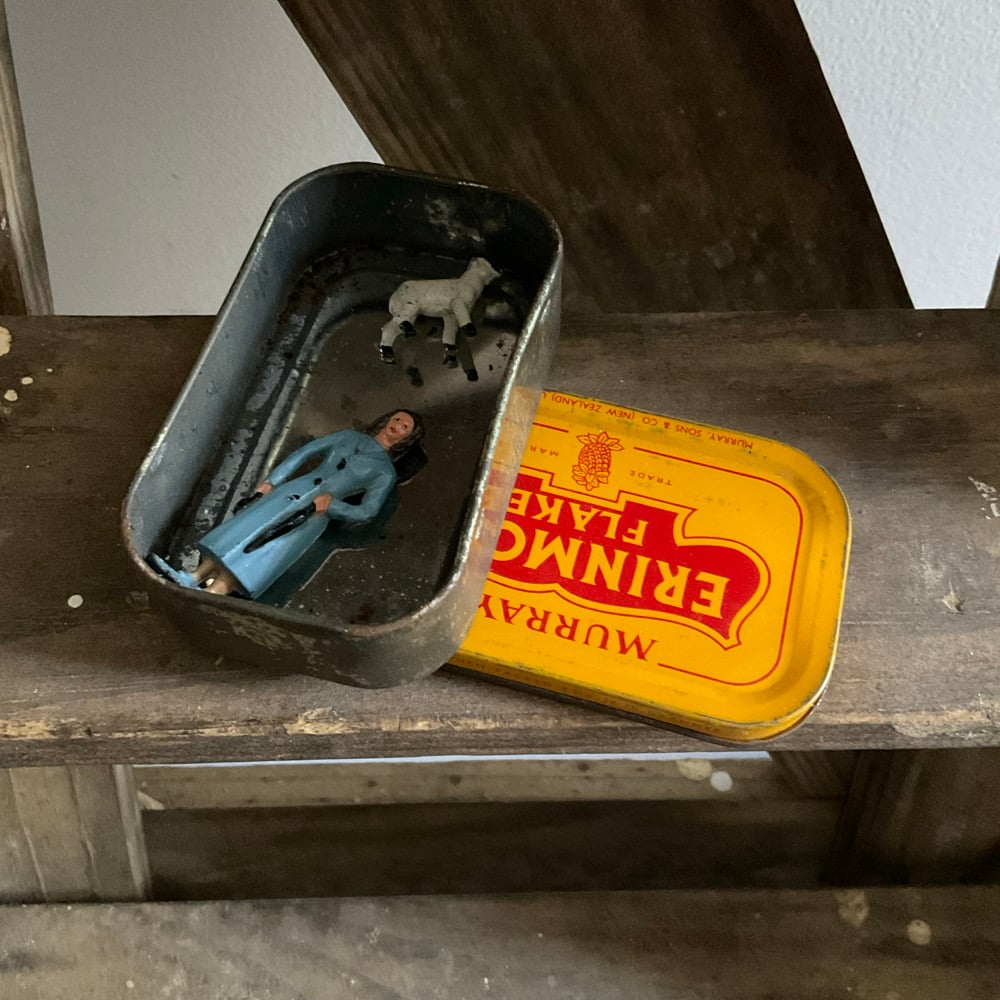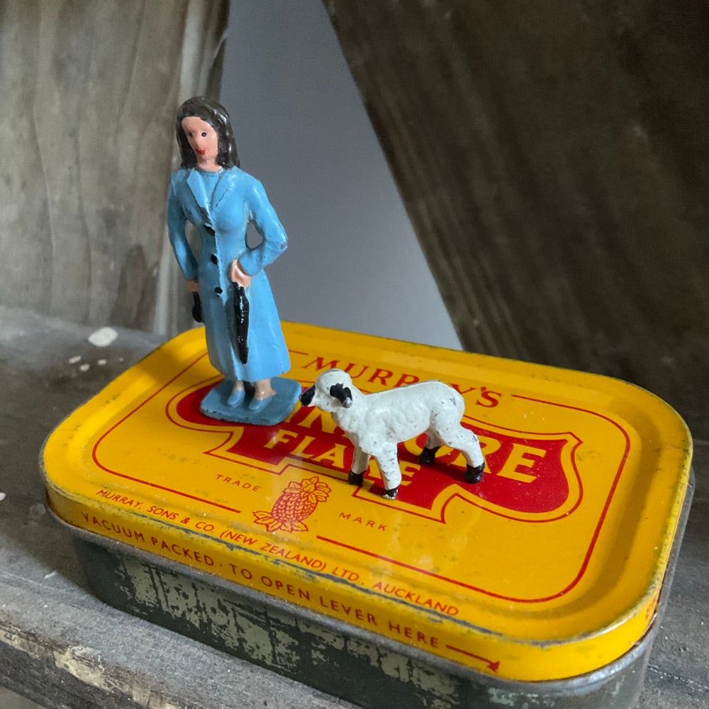 A vintage tobacco tin with an old toy Woman andtiny lamb.The toys are lead and British made,small but sweet.