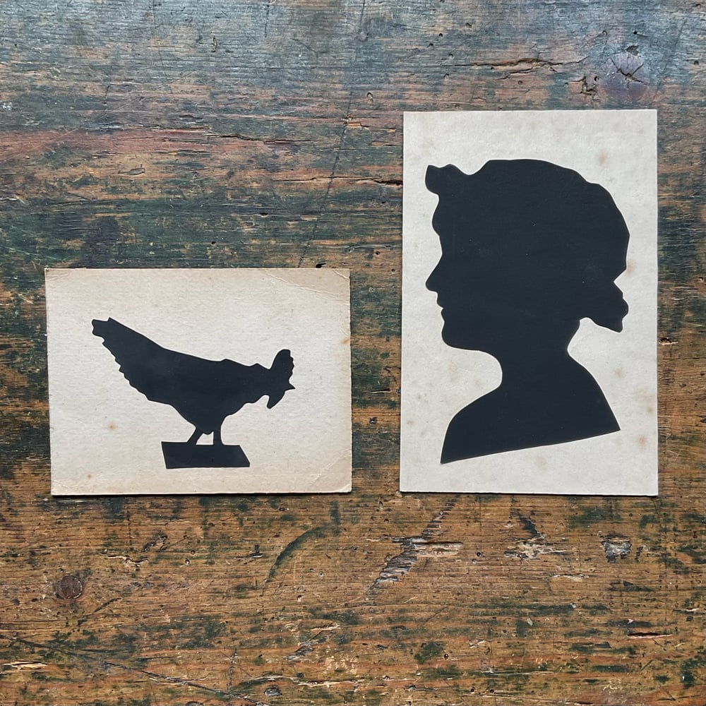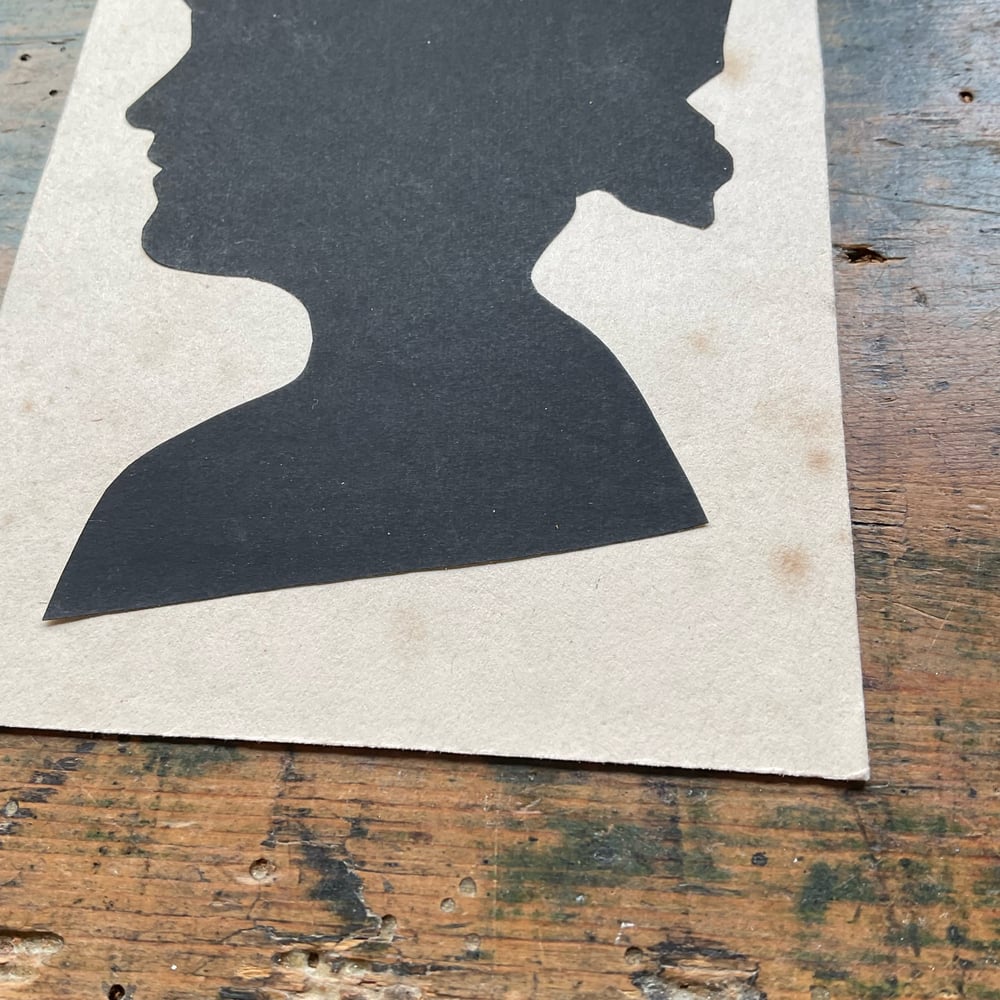 Two little old silhouettes,made from cut black paper and attached to thin backing card.